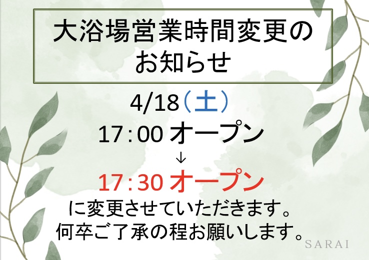 4/18(土)につきまして、大浴場の営業時間を変更させていただきます。